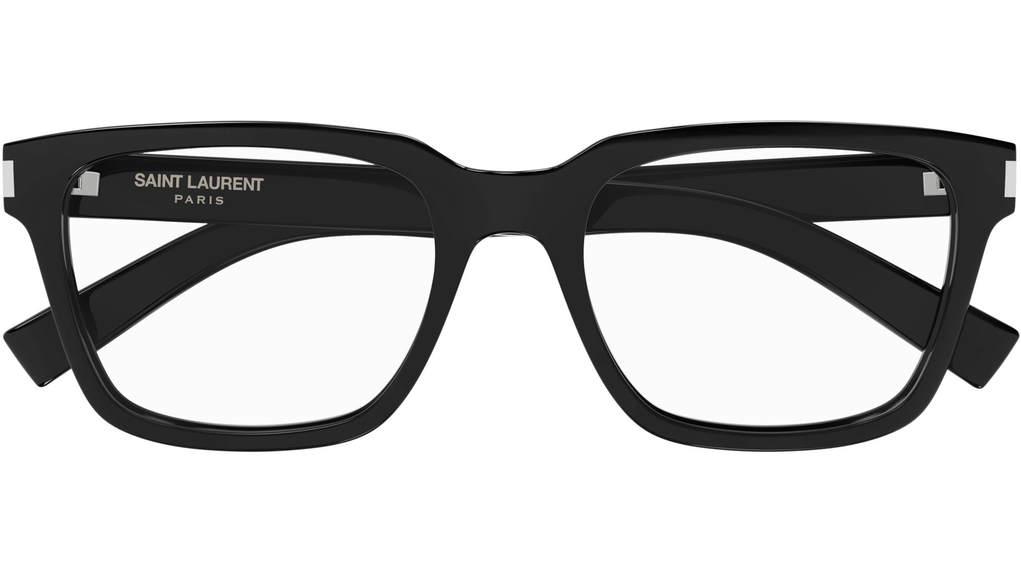 Occhiali da vista Saint Laurent modello SL 621 linea Classic codice colore 001 nero lucido tinta unita in acetato riciclato forma rectangle con aste color cristallo trasparente.