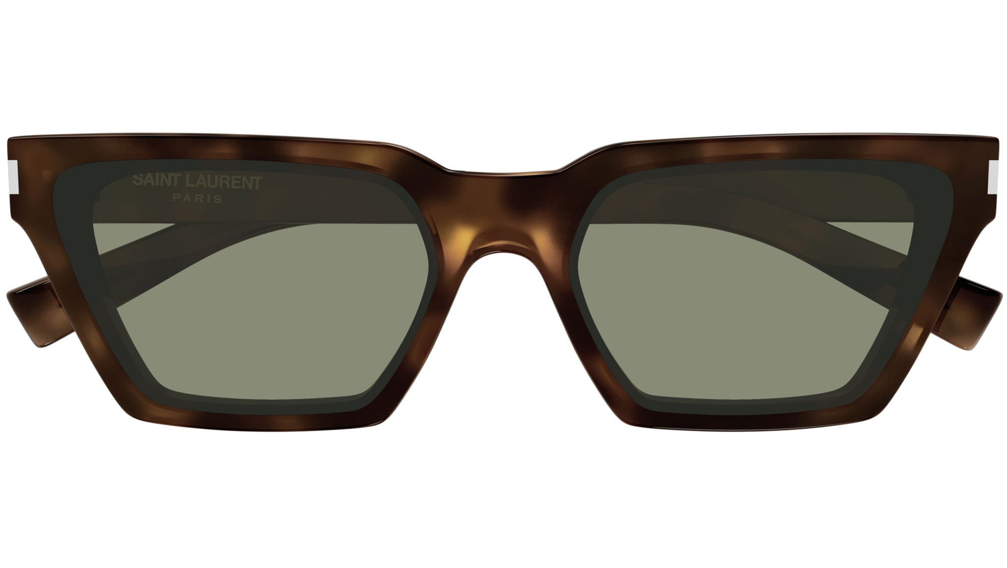 Occhiali da sole Saint Laurent modello SL 633 CALISTA linea New Wave codice colore 003 avana medio lucido in acetato riciclato forma cat eye con lenti color verde tinta unita.