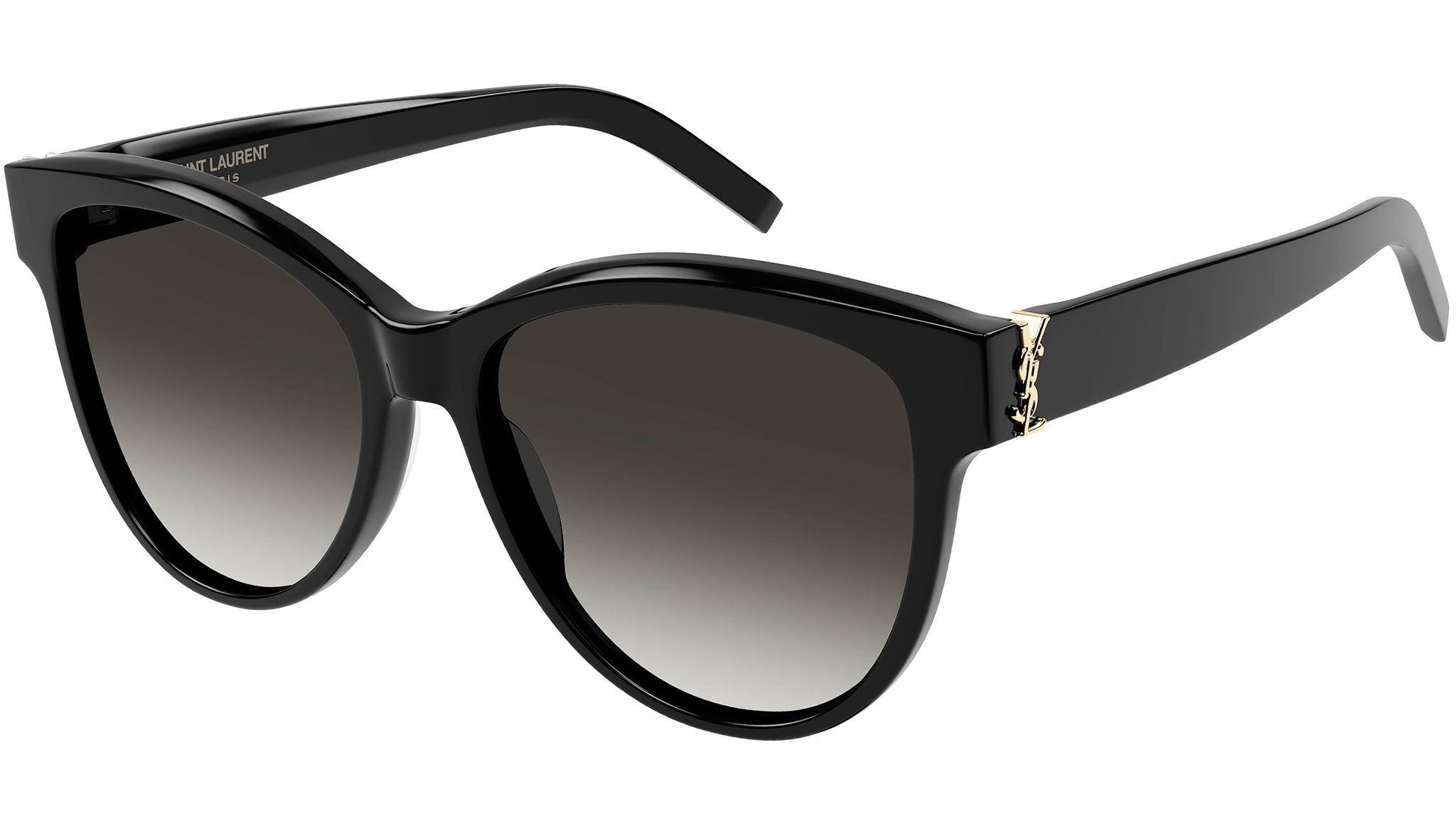 Occhiali da sole Saint Laurent linea Monogram modello SL M107 variante colore 002 nero lucido con lenti color grigio sfumato.