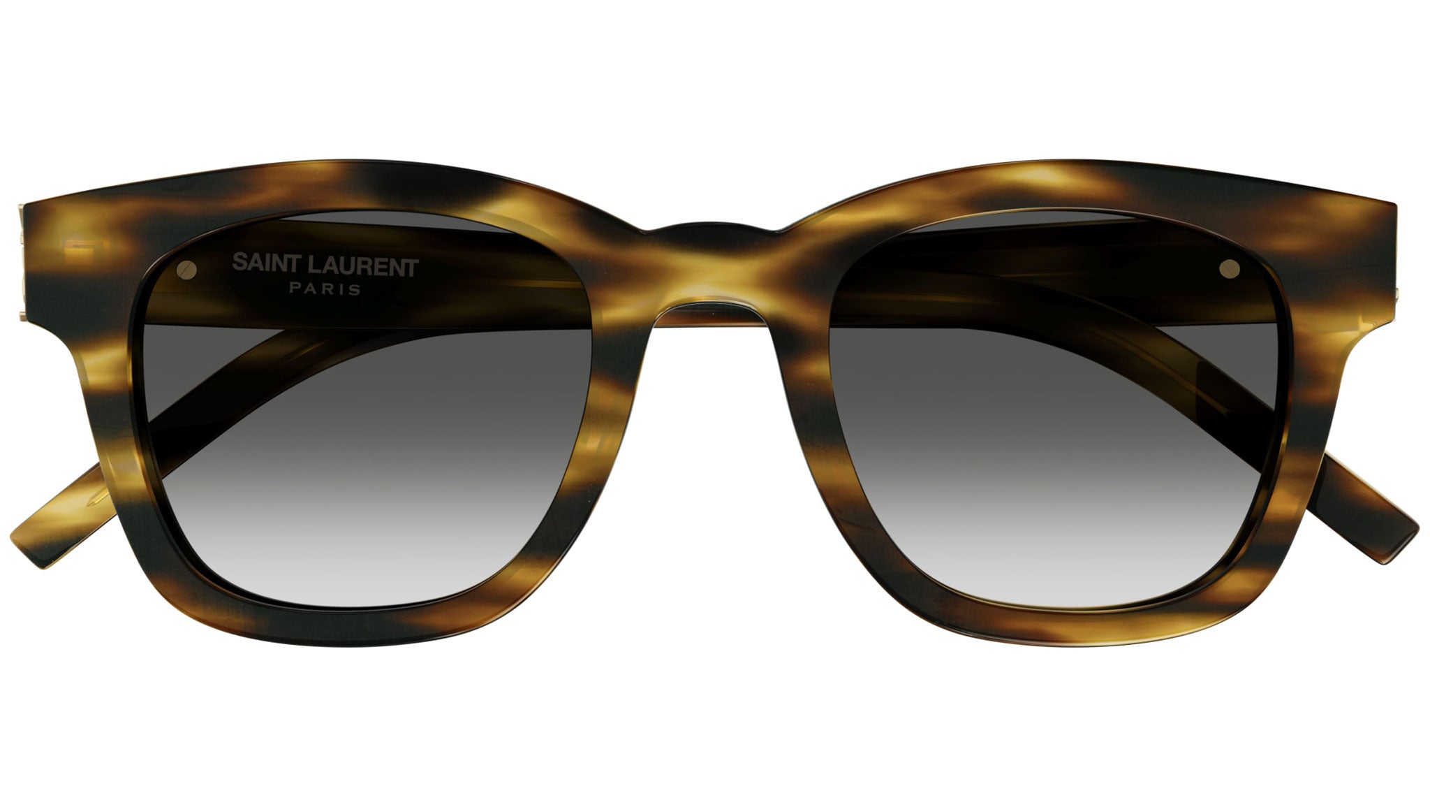 Occhiali da sole Saint Laurent modello SL M124 linea Monogram codice colore 003 avana fiammato lucido in acetato riciclato forma rectangle con lenti color grigio sfumato.
