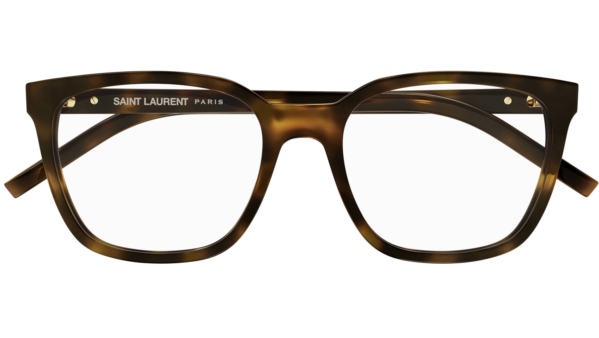 Occhiali da vista Saint Laurent modello SL M129 linea Monogram codice colore 003 avana medio lucido in acetato riciclato forma rectangle con aste color tartaruga.