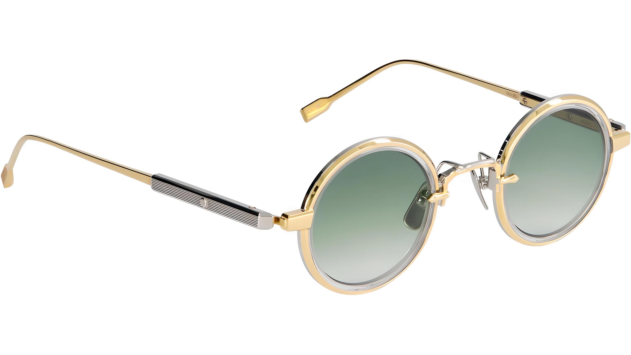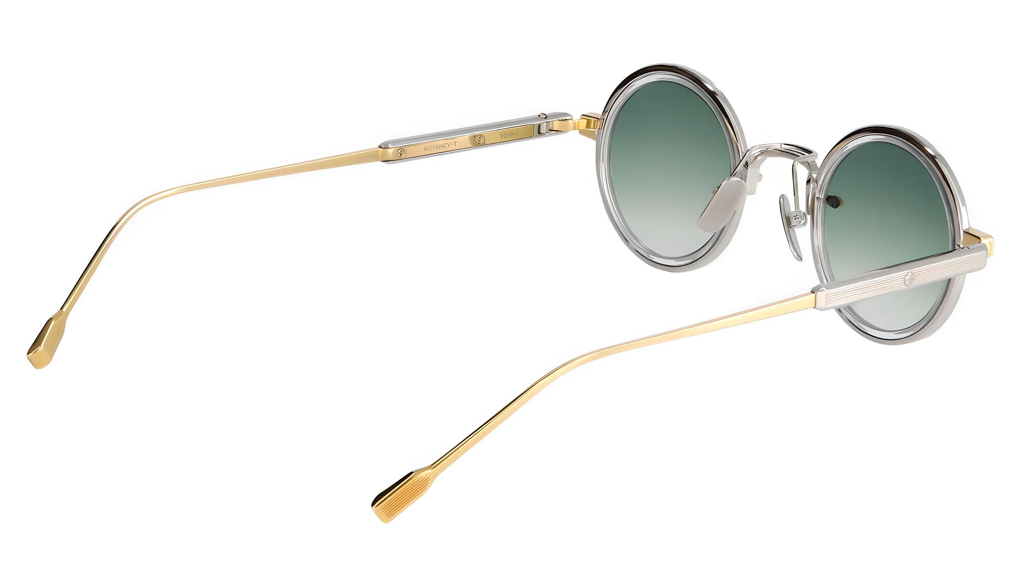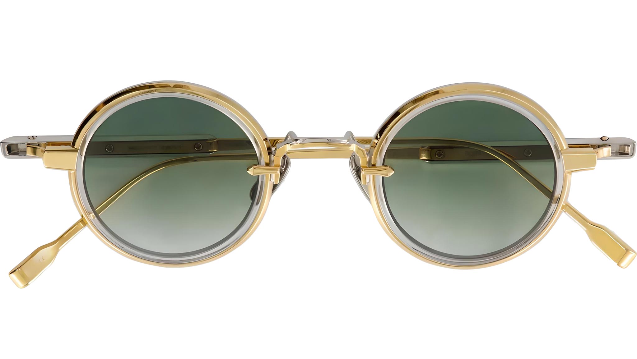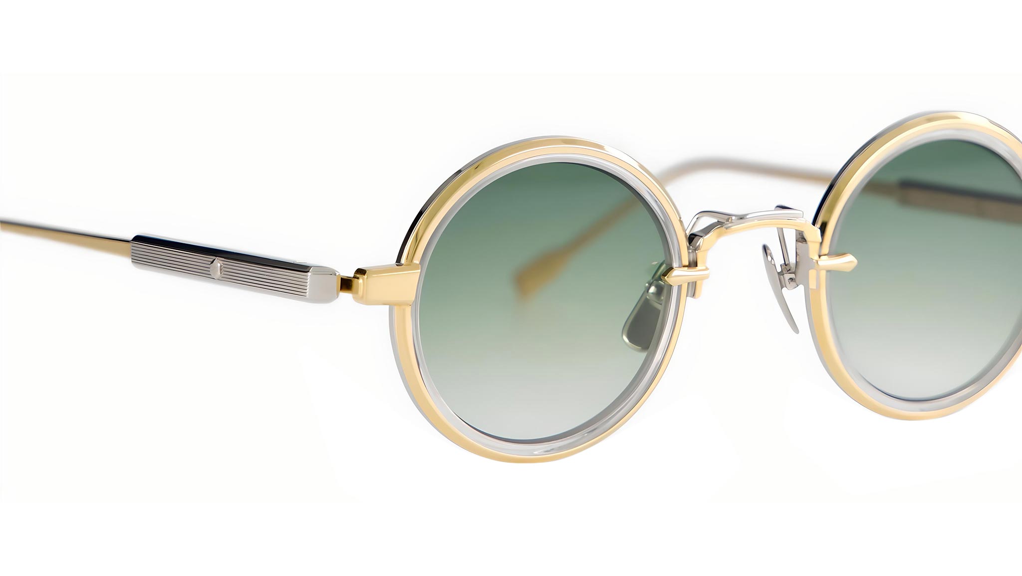 Gli occhiali da sole modello Rotanev-T YG/P-1 di Sato Eyewear presentano una montatura in titanio oro giallo e platino con inserto in takiron cristallo e lenti verdi sfumate. Mentre percorri la periferia di Miami, avvolto dall'abbraccio liberatorio del tramonto e dalle luci della città che esaltano la brillantezza delle montature, non indossi semplicemente degli occhiali, ma stai affermando il tuo stile.
