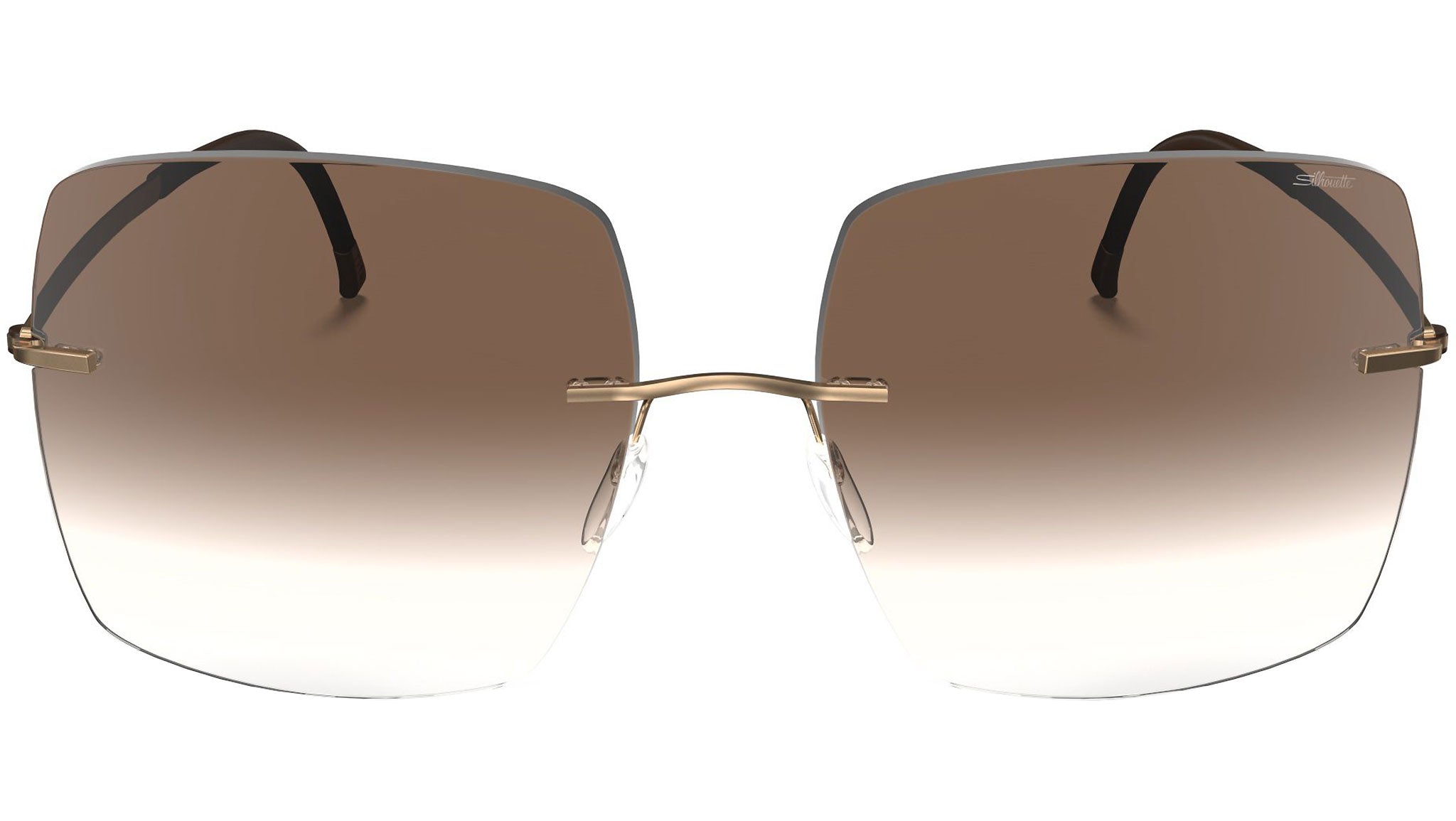 Silhouette Rimless Shades 8191 in 7530 frame color featuring classic brown gradient lenses. The Cadaqués model, with its oversized, rectangular lenses, is a nod to the distinctive flair of the 70s, offering a fashionable look. These glasses offer exceptional wearing comfort, are constructed without screws, and are hypoallergenic. The base 6 curvature provides a comfortable fit. The lenses feature an anti-reflective coating on the back, are made of high-impact polycarbonate, and offer complete protection from UV A, B, and C rays, equivalent to UV 400. Silhouette's Vision Sensation® technology aims to achieve a harmonious blend of frames and lenses for an optimal visual experience, as lenses are specifically tailored to fit their respective frames. These Vision Sensation® lenses are handcrafted with meticulous precision and are 100% made in Austria. Now, the benefits of Silhouette's Vision Sensation® technology extend to sunglasses as well.