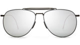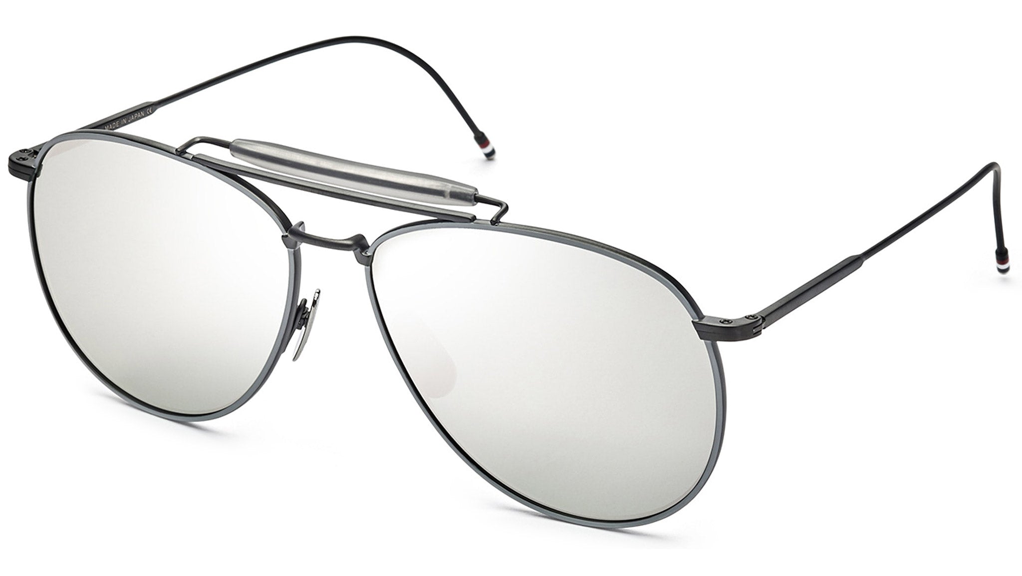 Acclaimed American designer Thom Browne is well renowned for his penchant for strong tailoring and playful casual pieces. Fixing its attention on the world of eyewear, his namesake label delivers the TB-015. Hand crafted in Japan in an aviator silhouette, this pair are built with a full titanium frame and come complete with signature tri-colour tips to the arms. This stylish design also features silver mirrored lenses that offer total protection from UV rays. Titanium Frames. Japanese Acetate Sweat Bar. Anti-Reflective Mirrored Lenses. 100% UV Protection. Made in Japan.