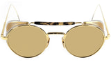 Realizzato a mano in Giappone, il TB-001 è integralmente di titanio, che conferisce leggerezza e durabilità. La montatura placcata in oro è adornata con aste rifinite in rosso, bianco e blu Thom Browne e paranaselli laterali perforati che si piegano elegantemente, per praticità. Le cerniere su misura precisione, la barra sopraccigliare tartarugata Tokyo e i naselli incisi con quattro barre accentuano il suo stile unico.